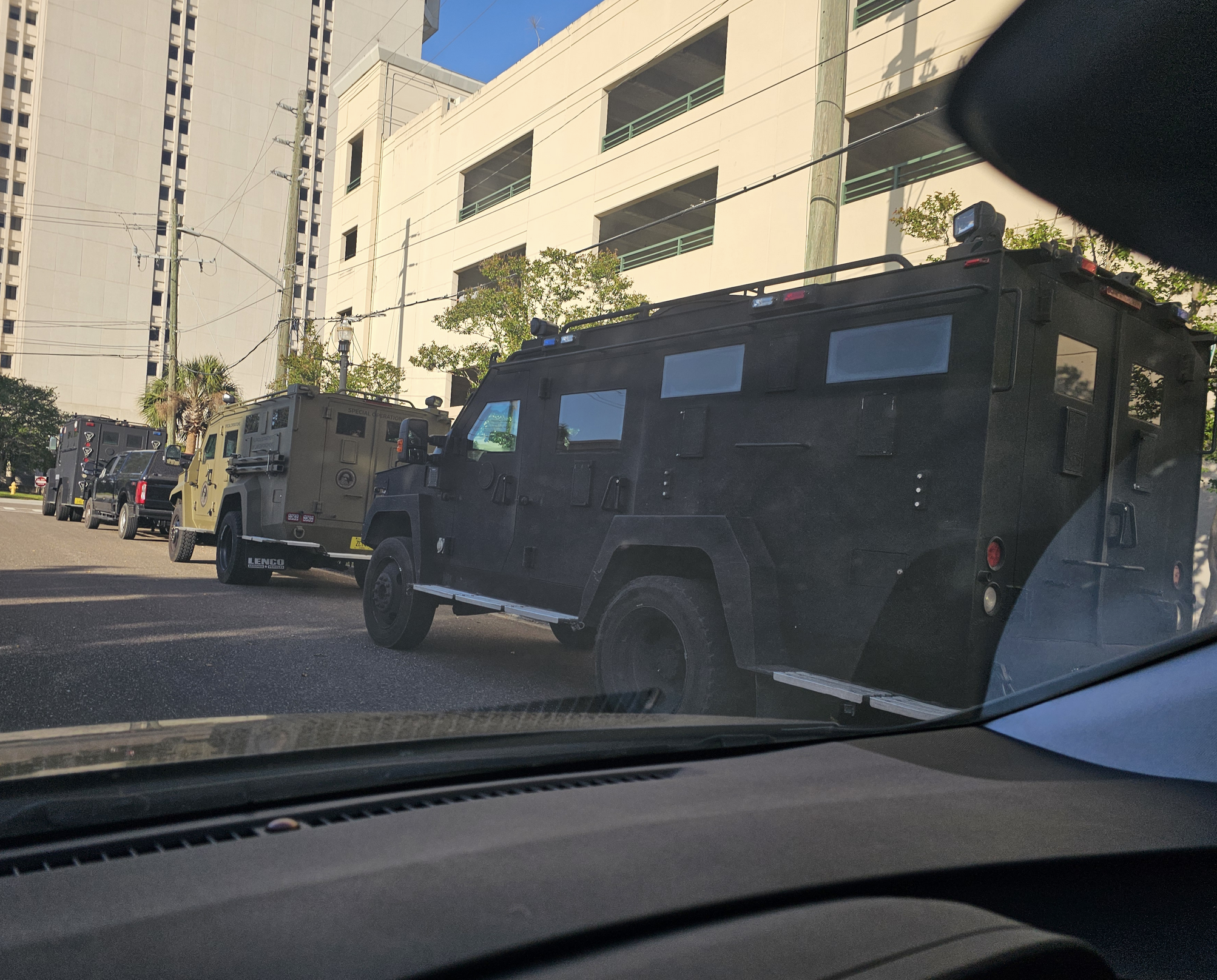 military and police vehicles blocking entrance to complex and 20-30 military and police surrounding the building. ..